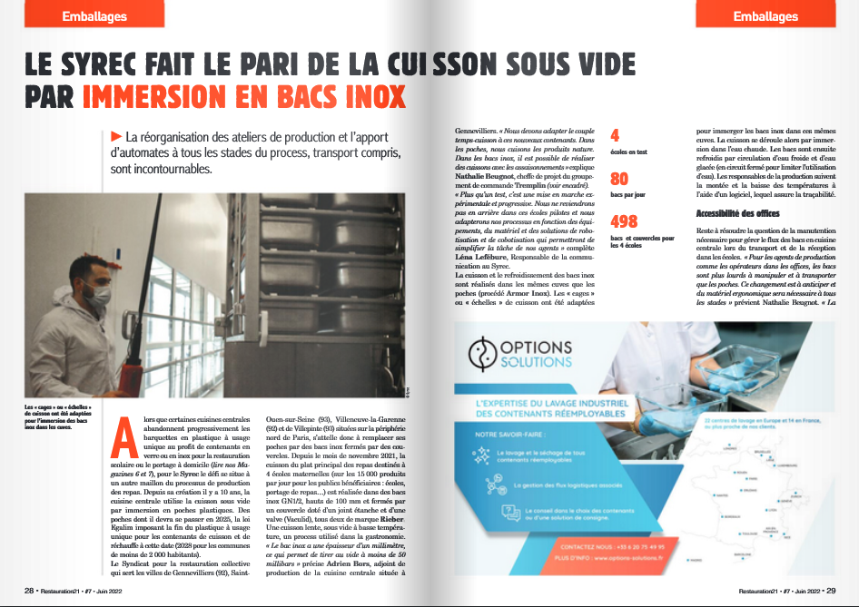 Le Syndicat pour la restauration collective qui sert les villes de Gennevilliers (92), Saint-Ouen-sur-Seine (93), Villeneuve-la-Garenne (92) et de Villepinte (93), situées sur la périphérie nord de Paris, s’attelle donc à remplacer ses poches par des bacs inox fermés par des couvercles. Depuis le mois de novembre, la cuisson du plat principal des repas destinés à 4 écoles maternelles (sur les 15 000 produits par jour pour les publics bénéficiaires : écoles, portage de repas…) est réalisée dans des bacs inox GN1/2 , haut de 100 mm et fermés par un couvercle doté d’un joint étanche et d’une valve, les 2 éléments étant de marque Rieber. Une cuisson lente, sous vide à basse température, un process utilisé dans la gastronomie.