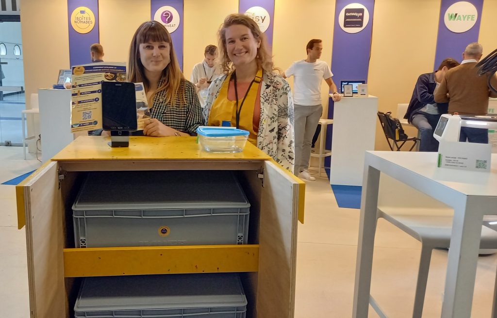Les Boîtes nomades, qui travaillent avec une quarantaine de restaurants, veulent aider les entreprises désireuses d’inciter leurs salariés à consommer leur déjeuner dans des contenants réutilisables. L’entreprise, créé par Typhenn Leplay, a conçu un meuble de collecte, en collaboration avec Panopoli, fabriqué localement à partir de matériaux issus du réemploi : contreplaqué récupéré de chantiers de déconstruction et plastiques recyclés. Les salariés y déposent leurs boîtes sales après leur repas et récupèrent directement leur consigne. « Nous les accompagnons dans la réduction de leurs déchets en créant une cagnotte de consigne pour chacun de leurs salariés, utilisable dans tout notre réseau de partenaires pour emprunter des contenants » explique la jeune entreprise qui assure ensuite la collecte des boîtes à vélo, puis leur lavage, avant de les réinsérer dans le réseau. www.lesboitesnomades.com