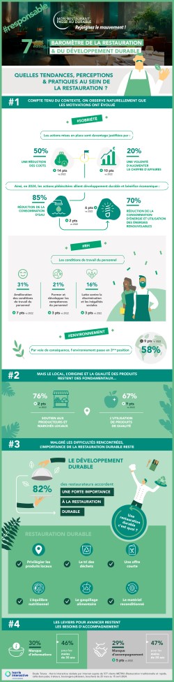 De tendance, la restauration durable est devenue une opportunité économique majeure, marquée par un contexte inflationniste. Pour 1 restaurateur sur 2, les pratiques durables se traduisent par la baisse des coûts opérationnels : réduction des factures de consommation d’eau et d’énergie. Pour 20% d’entre eux, elles offrent un potentiel d’augmentation du chiffre d’affaires. Enfin, il n’y a pas de restauration durable sans la recherche de la l’amélioration des conditions de travail du personnel, la formation du personnel et la lutte contre les discriminations et les inégalités sociales.