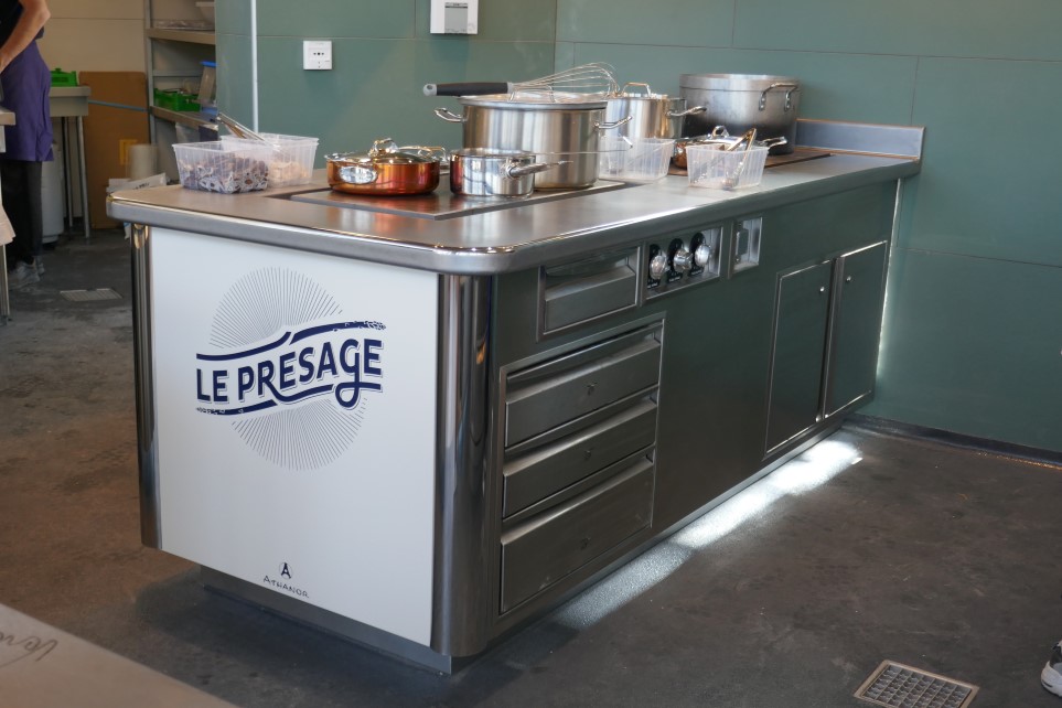« Au centre de la plaque, la température peut monter à 450 degrés » précise Pierre André Aubert, ex-ingénieur en aéronautique, cuisinier et fondateur du Présage. Pour maîtriser la température des cuissons, le cuisinier éloigne ou rapproche ses marmites et casseroles du centre. Les tiroirs chauffants permettent de conserver à température pour le service du soir ce qui a été cuisiné le matin. D’ici quelques temps, l’équipe de cuisine disposera d’un four à 6 niveaux alimenté par un 2e miroir réflecteur, « un ancien four Unox gaz ‘refité ‘en solaire » ajoute-t-il.