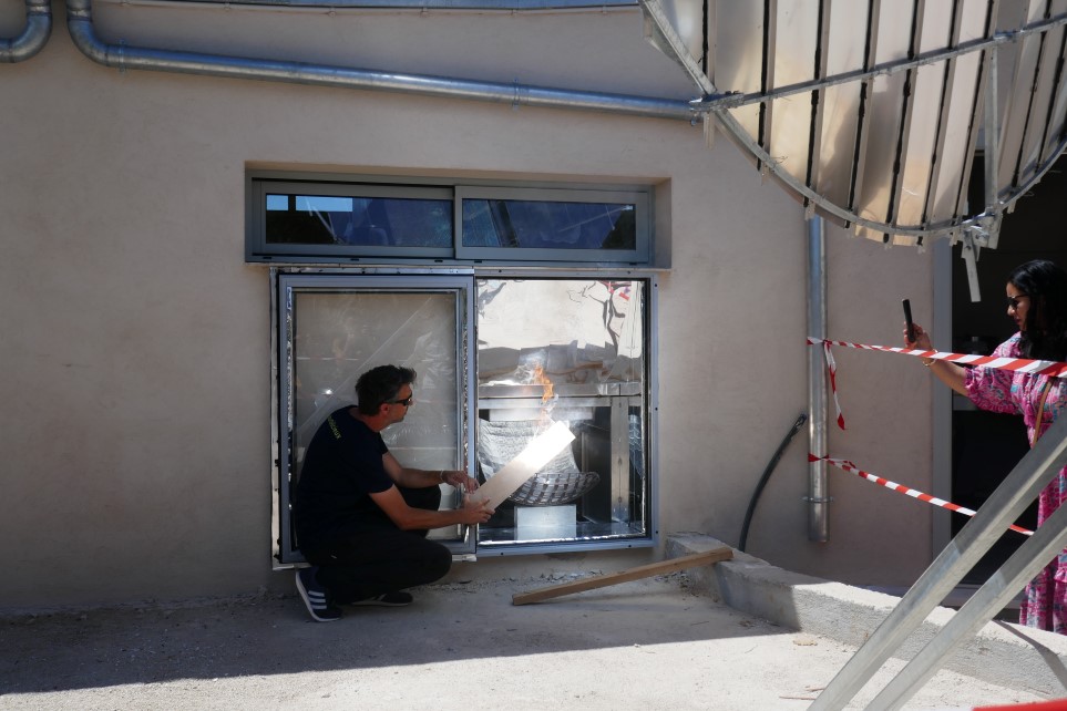 Le fourneau biénergie Athanor. A gauche, la plaque électrique, à droite la plaque alimentée par la chaleur solaire capté par le miroir parabolique de l’autre côté du mur. ©Restauration21