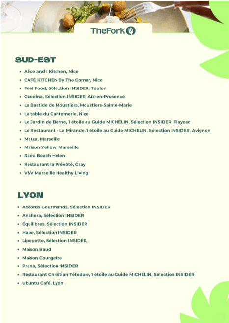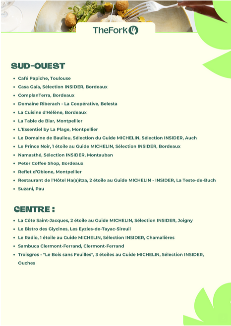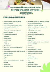 Le leader européen de la réservation de restaurants en ligne, TheFork (Tripadvisor) dévoile sa liste des 100 meilleurs restaurants écoresponsables hexagonaux (cf plus bas). Une sélection « basée sur les notes et avis vérifiés » des clients, et « vérifiée et approuvée par le label FiG, pour s’assurer de l’écoresponsabilité des restaurants » selon le communiqué. Elle prend également en compte les établissements bénéficiant des labels et distinctions Michelin Etoile Verte, Fig ou Ecotable, les filtres « vegan», « végétarien », « local » et « bio».