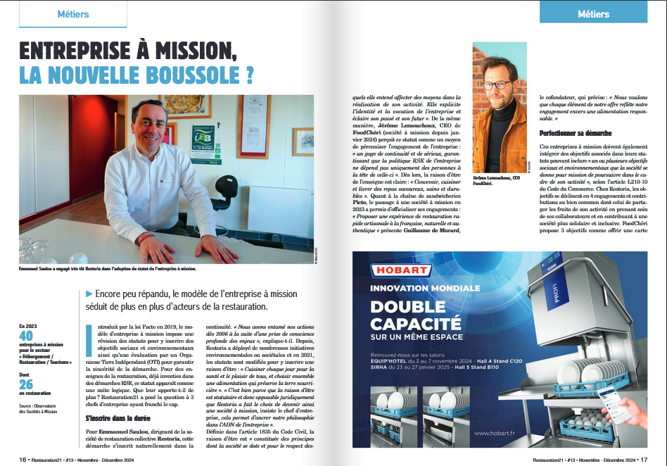 Introduit par la loi Pacte en 2019, le modèle d’entreprise à mission impose une révision des statuts pour y inscrire des objectifs sociaux et environnementaux ainsi qu’une évaluation par un Organisme Tiers Indépendant (OTI) pour garantir la sincérité de la démarche. Pour des enseignes de la restauration, déjà investies dans des démarches RSE, ce statut apparaît comme une suite logique. Que leur apporte-t-il de plus? Restauration21 a posé la question à 3 chefs d’entreprise ayant franchi le cap.