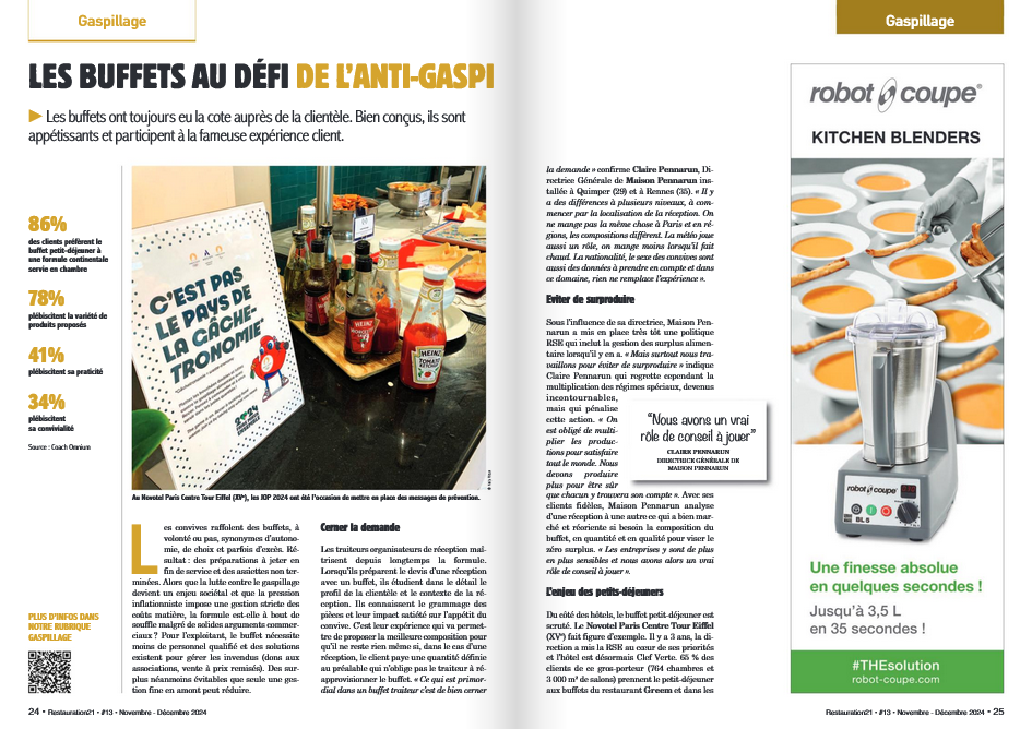 Du côté des hôtels, le buffet petit-déjeuner est scruté. Le Novotel Paris Centre Tour Eiffel (XVe) fait figure d’exemple. Il y a 3 ans, la direction a mis la RSE au cœur de ses priorités et l’hôtel est désormais Clef Verte. 65 % des clients de ce gros-porteur (764 chambres et 3000 m² de salons) prennent le petit-déjeuner aux buffets du restaurant Greem et dans les salons «Groupes ». Pour réduire le gaspillage alimentaire, Clément Proy, responsable RSE, accompagne les équipes de la restauration dans l’organisation et le déroulement du service. Le succès de cette démarche repose sur la coordination entre les différents services qui travaillent pour assurer une gestion efficace des ressources. « C’est grâce à l’implication de chacun que nous avons atteint une première baisse du gaspillage alimentaire » confie-t-il. Dès que l’affluence diminue, les buffets de la salle réservée aux groupes sont transférés vers le Greem. « Cela nous permet de diminuer l’approvisionnement des buffets une fois le rush passé et ainsi réduire le gaspillage » explique-t-il. Il a aussi travaillé sur les contenants, « avec une préférence pour des bacs ½ gastro sur les chafing dish ou des plateaux plus petits pour présenter certains pains. Des contenants plus petits ou moins profonds donnent une impression de volume alors qu’ils contiennent en réalité moins de denrées ». Au moment du service, il est en salle pour s’assurer que les consignes sont appliquées et que la communication salle/cuisine est fluide.
