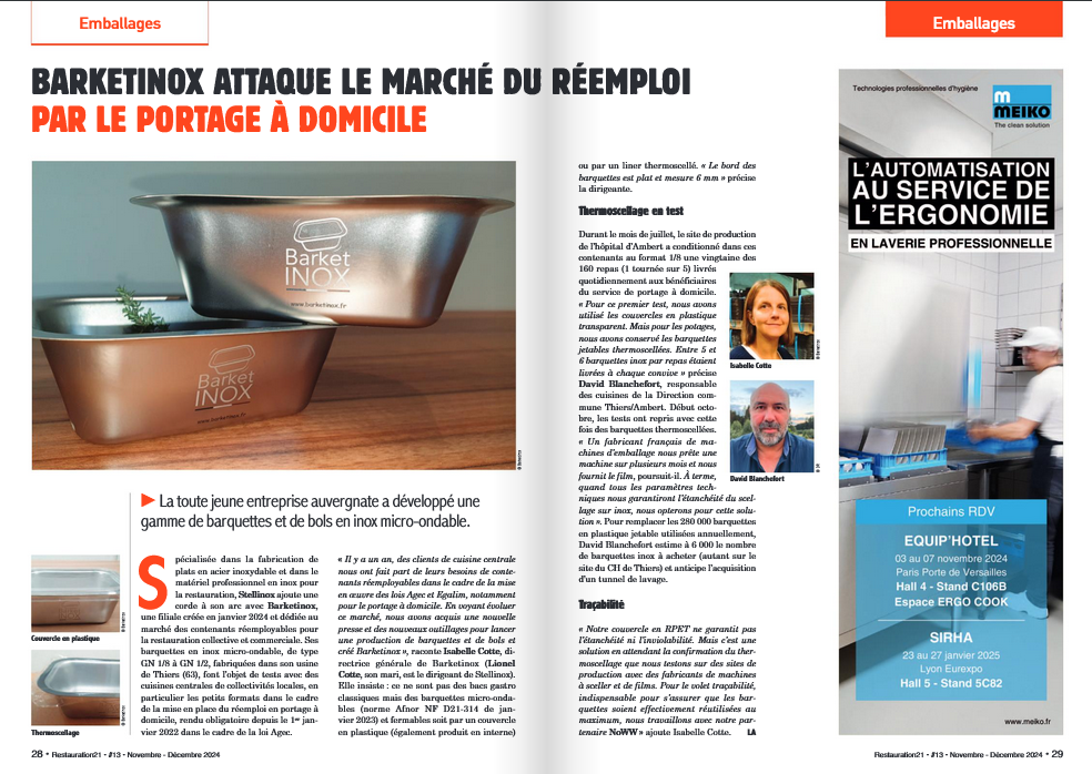 Au Sidoresto (Syndicat Intercommunal à Vocation Unique qui regroupe les villes de Gentilly et de Vitry-sur-Seine dans le Val-de-Marne), les tests sur les alternatives aux barquettes en plastique à usage unique, interdites au 1er janvier 2025 (lire pages 14-15), portent sur des bacs gastronormes en inox (Duralipack Inox de Rescaset) operculés par un film spécifique développé pour le conditionnement à chaud et le refroidissement rapide. 3 établissements ont été ciblés: 2 écoles élémentaires, l’une avec un self, l’autre avec un service à table, et une école maternelle « afin d’avoir toutes les configurations possibles » comme l’expliquaient à Restauration21 Fabrice Boudon, le directeur du Syndicat, et Laetitia Fernandez, son adjointe, au début de l’été.