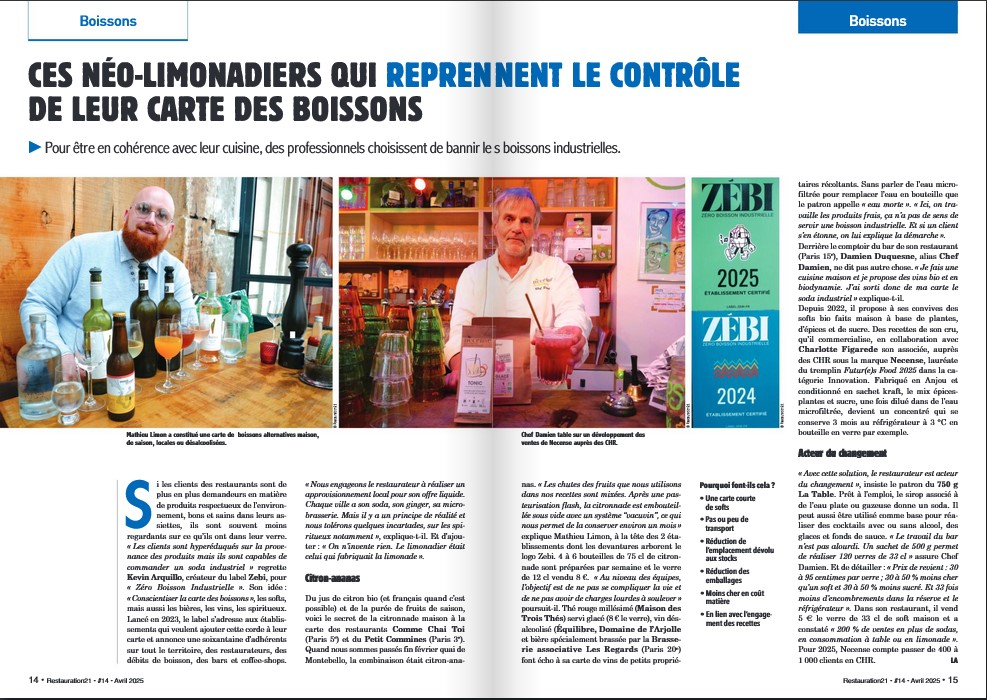 Si les clients des restaurants sont de plus en plus demandeurs en matière de produits respectueux de l’environnement, bons et sains dans leurs assiettes, ils sont souvent moins regardants sur ce qu’ils ont dans leur verre. « Les clients sont hyperéduqués sur la provenance des produits mais ils sont capables de commander un soda industriel » regrette Kevin Arquillo, créateur du label Zébi, pour « Zéro Boisson Industrielle ». Son idée: « Conscientiser la carte des boissons », les softs, mais aussi les bières, les vins, les spiritueux. Lancé en 2023, le label s’adresse aux établissements qui veulent ajouter cette corde à leur carte et annonce une soixantaine d’adhérents sur tout le territoire, des restaurateurs, des débits de boisson, des bars et coffee-shops. « Nous engageons le restaurateur à réaliser un approvisionnement local pour son offre liquide. Chaque ville a son soda, son ginger, sa micro-brasserie. Mais il y a un principe de réalité et nous tolérons quelques incartades, sur les spiritueux notamment », explique-t-il. Et d’ajouter: « On n’invente rien. Le limonadier était celui qui fabriquait la limonade ».