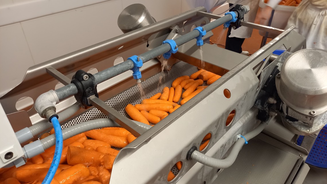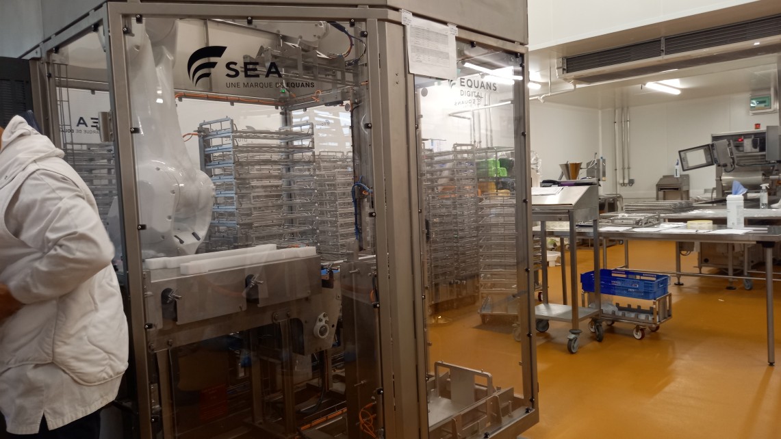La zone cuisson a été équipée de nouvelles marmites (Charvet) dont deux connectées (pour les cuissons de nuit) et huit de fours. A l’entrée de la ligne de conditionnement (Mecapack), les agents remplissent et pèsent les bacs sur des postes réalisés sur mesure et utilisent une doseuse semi-automatique pour les sauces. A la sortie de la ligne, un robot (Equans) place les bacs banderolés (Getra) sur les caisses filaires (Goupil/Restaubac) associées aux socles rouleurs via la solution logicielle de traçabilité (Hub One), tous ces élément étant dotés d’un QR code. Un cobot pour déposer les couvercles sur les bacs devrait compléter le dispositif dans les prochains mois. Les entrées, desserts et autres composantes froides sont traités sur une seconde ligne de conditionnement semi-automatisée (banderolage).