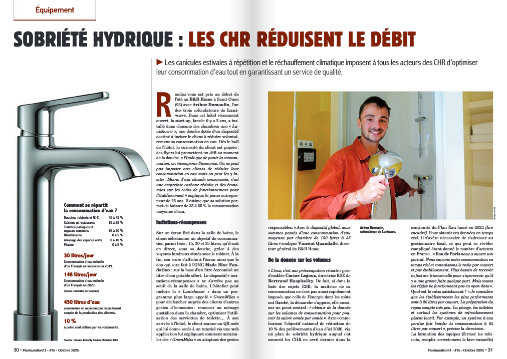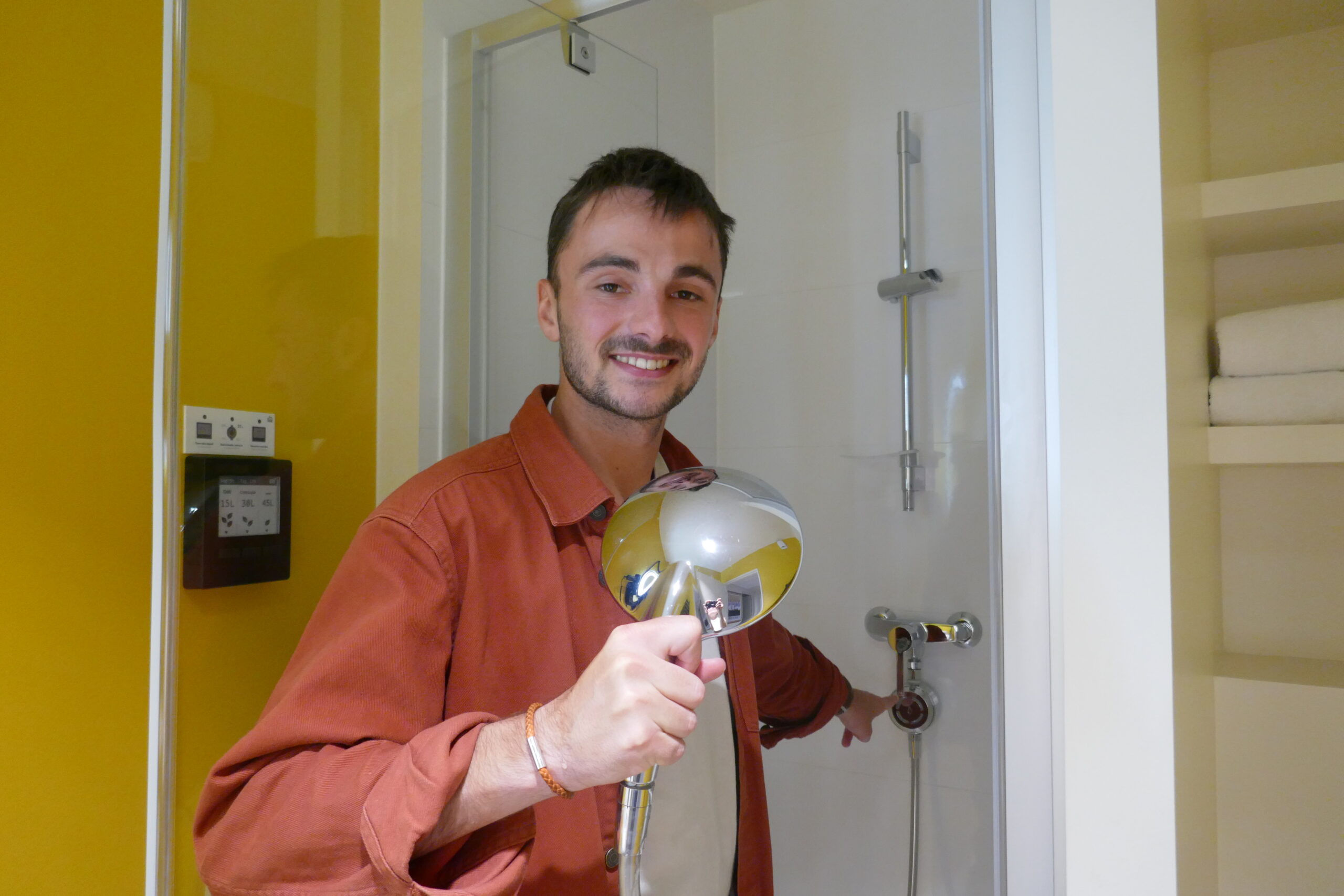 Rendez-vous est pris au début de l’été au B&B Home à Saint-Ouen (93) avec Arthur Dumoulin, l’un des trois cofondateurs de Luniwave. Dans cet hôtel récemment ouvert, la start-up, lancée il y a 2 ans, a installé dans chacune des chambres une « Lunishower », une douche dotée d’un dispositif destiné à inciter le client à réduire volontairement sa consommation en eau. Dès le hall de l’hôtel, la curiosité du client est piquée: des flyers lui promettent un défi au moment de la douche. « Plutôt que de punir la consommation, on récompense l’économie. On ne peut pas imposer aux clients de réduire leur consommation en eau mais on peut les y inciter. Moins d’eau chaude consommée, c’est une empreinte carbone réduite et des économies sur les coûts de fonctionnement pour l’établissement » explique le jeune entrepreneur de 25 ans. Il estime que sa solution permet de baisser de 35 à 55 % la consommation moyenne d’eau.
